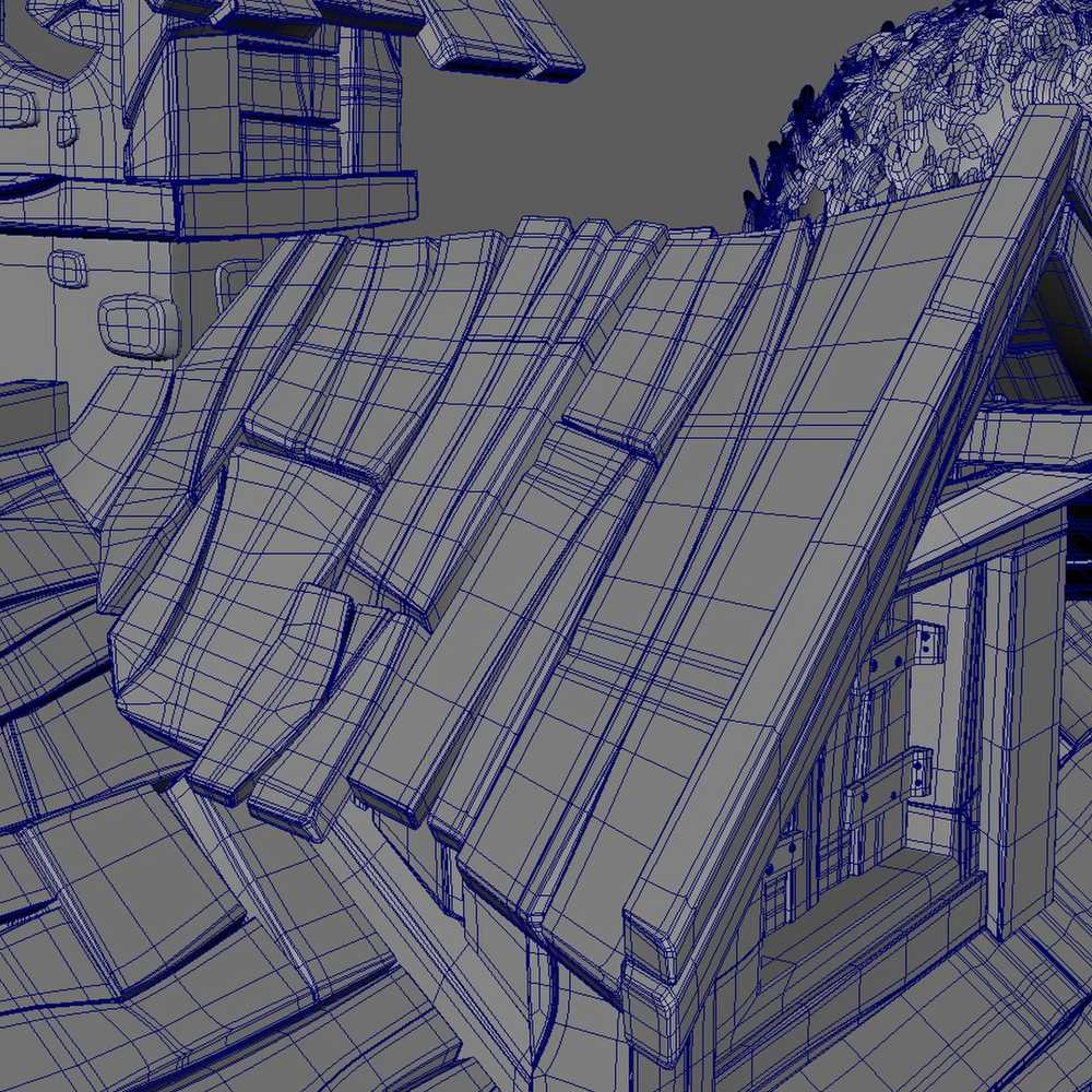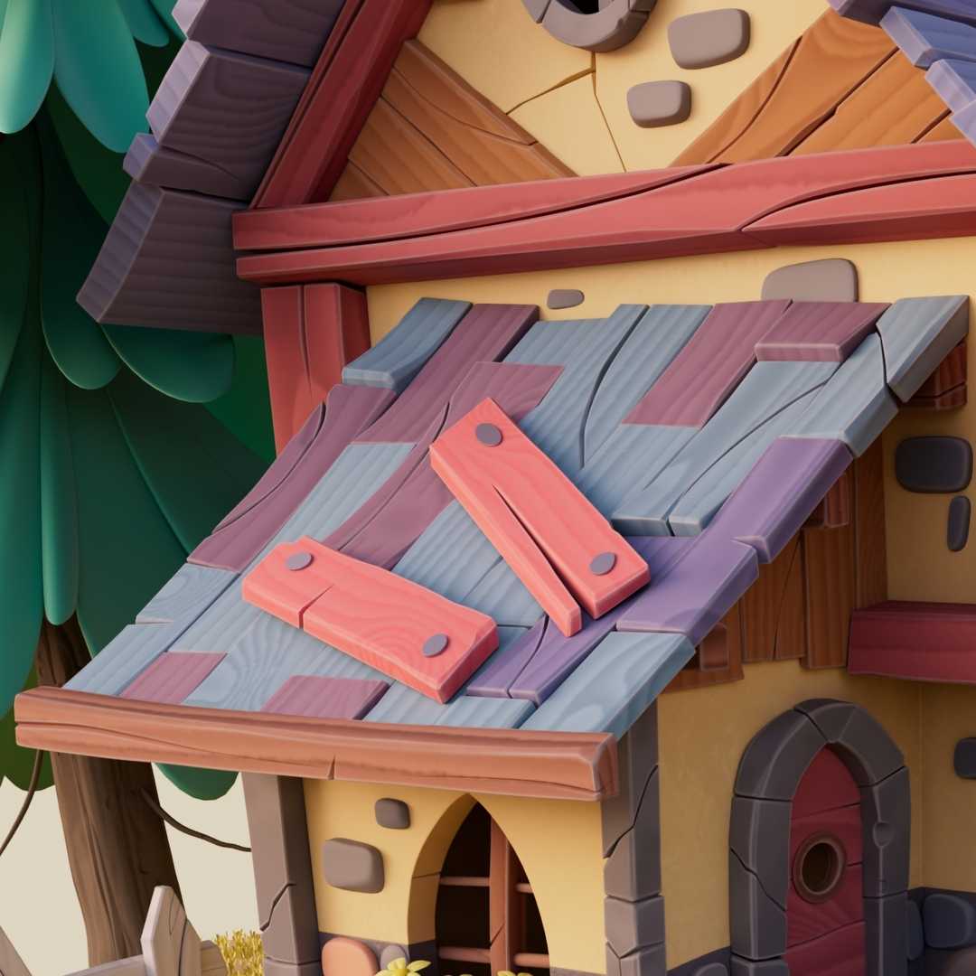 For the wood planks, I first modeled 3 base planks with different lengths, then used wrap and blendshape deformers to duplicate and get the planks in the right spots on the roof. I would then sculpt and model unique variations from these duplicates while thinking of silhouette and breakup so it's not too repetitive. I did a similar process for the stones on the stone path and the ones on the walls of the house.